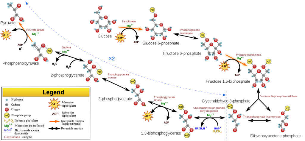 A glicólise é o processo em que 2 moléculas de ácido pirúvico são produzidas a partir de 1 molécula de glicose. Nas etapas iniciais, 2 ATPs são consumidos, mas nas etapas finais, 4 ATPs são produzidos, resultando em um saldo de 2 ATPs. Dois NAD⁺ são necessários nesse caminho metabólico.