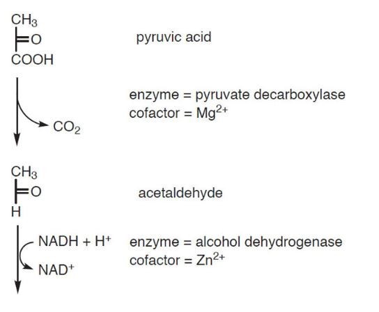Quando a levedura não tem oxigênio ou quando o efeito Crabtree é ativado (devido ao alto teor de açúcar), o ácido pirúvico é convertido em acetaldeído e, em seguida, em etanol, reciclando 1 NADH para NAD⁺. Essa via não é a mais eficiente para as leveduras, já que o etanol é tóxico, mas é essencial para a produção de NAD⁺. Outro beneficio na geração da fermentação alcolica é a eliminação da competição, pois as bactérias do meio possuem uma tolerância a etanol muito mais baixa que da levedura, logo, em baixas concentrações de etanol a levedura consegue sobreviver e se manter livre de competidores.
