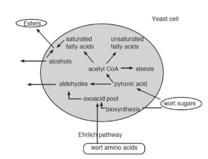 A coenzima A acetilada (acetil-CoA) é a base para muitas vias secundárias que produzem álcoois superiores, ésteres, diacetil, fenóis e glicerol. A oxidação do piruvato leva à formação de acetil-CoA, consumindo um NAD⁺.