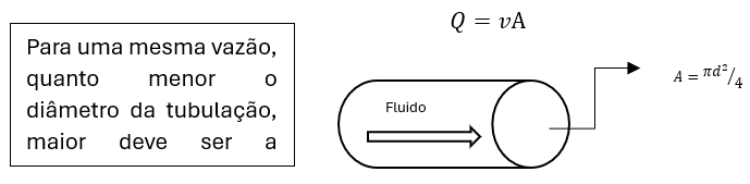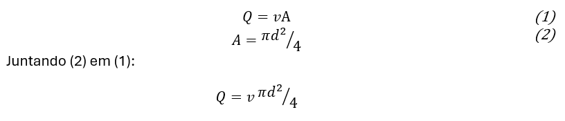 Vazão é a quantidade de fluido que passa por uma seção transversal de tubulações. Quantidade essa verificada por unidade de tempo. Ou seja, se sabemos que a vazão é de 25.000 L/h, significa que a cada 1 h passa pela tubulação 25.000 L de fluido. Essa vazão está diretamente relacionada a velocidade que esse fluido percorre e a área da seção transversal da tubulação. Vamos chamar a Vazão de Q, velocidade de v, área da seção transversal de A e diâmetro da tubulação de d: