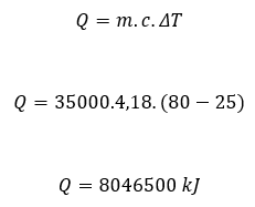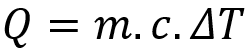 Q é a energia necessária em kJ, é a massa do líquido em kg, é a capacidade calorífica específica em kJ/kg°C, e é a diferença de temperatura em °C.