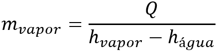 Sabendo a energia térmica necessária, podemos calcular a quantidade de vapor requerida. Mas antes, para saber quanto de vapor precisamos, temos que entender quanto calor o vapor nos fornece ao se condensar e transferir calor para o líquido. O calor que o vapor libera quando condensa é a entalpia de vapor. Que será afetada pela pressão do vapor. Quando maior a pressão que o vapor se encontra, maior essa energia liberada e maior a temperatura que esse vapor saturado se encontra. Por exemplo se o vapor estiver a 3 bar ele libera entalpia de aproximadamente 660 kcal/kg. Agora sim, vamos calcular a quantidade de vapor necessária (em kg) que é dada pela divisão da energia total pelo calor latente: