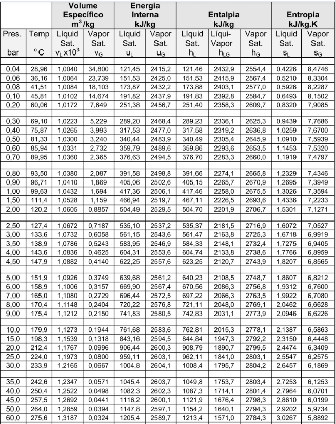 Tabela 1: Propriedades da água saturada